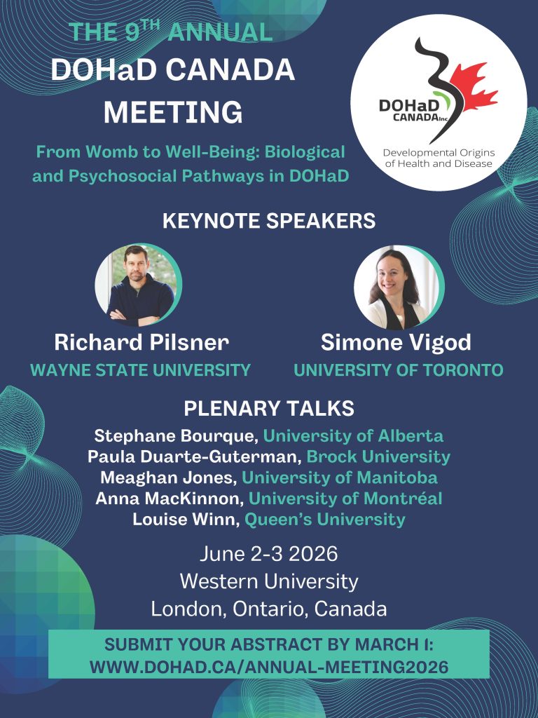 DOHaD Canada’s 9th Annual Meeting will take place June 2-3, 2026 at Western University (London, Ontario, Canada) with the theme “From Womb to Well-Being: Biological and Psychosocial Pathways in DOHaD.”